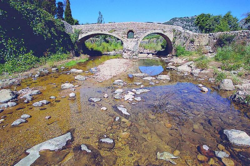 Dahinter auf einem gepflasterten Weg über den Osthang zu einer Gabelung hinunter. Nach dem Wegweiser des GR-221 geradeaus…