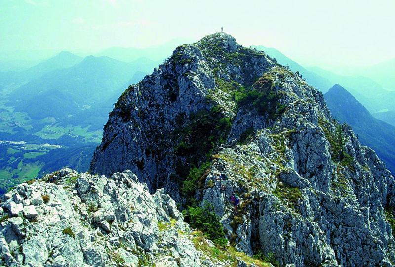 Anspruchsvolle Bergtour mit gesichertem Gipfelanstieg (oder Gratüberschreitung, Kletter-Schwierigkeitsgrad I–II). EINKEHR | Unterwegs keine, Gasthöfe in Steyrling